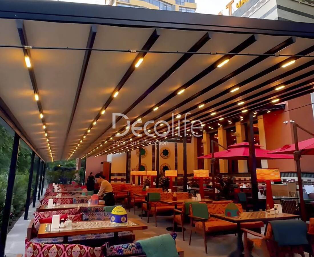 Тентовая пергола Decolife Basic&Pro New, реализовано партнером "TENT VERTEX" - г. Алматы, чайхана "Navat"